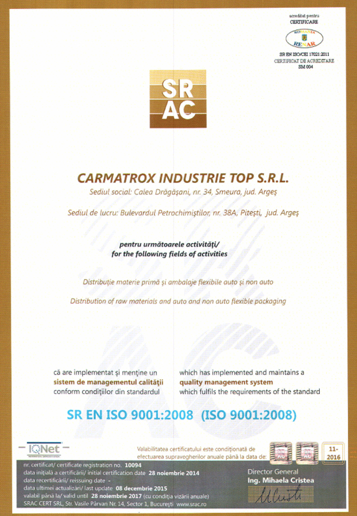- Suntem in curs de certificare a ambalajelor noastre pentru transportul marfurilor periculoase (ADR). Certificarea va veni in intampinarea nevoilor clientilor nostri care produc diverse substante chimice ale caror ambalare si transport au nevoie, pe langa respectarea unor standarde de calitate foarte inalte, inclusiv de aceasta certificare marcata pe ambalaj